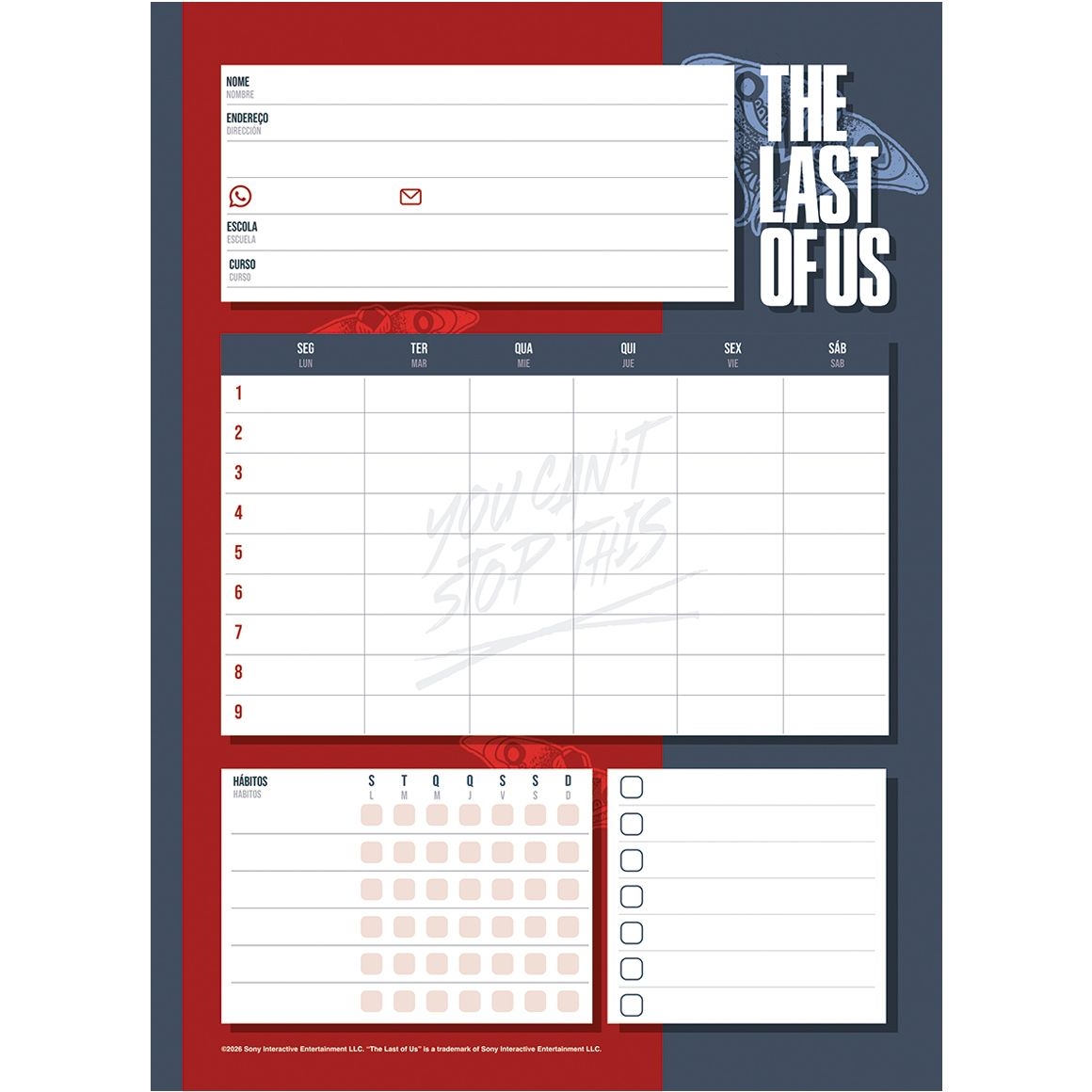 The Last Of Us Parte II é um jogo eletrônico de ação-aventura que narra um futuro pandêmico devastador para a humanidade. O Caderno Universitário Capa Dura inspirado no jogo busca retratar esse enredo através de suas diferentes capas, com elementos e cores caracteríticas e, ainda, a presença dos personagens em si.